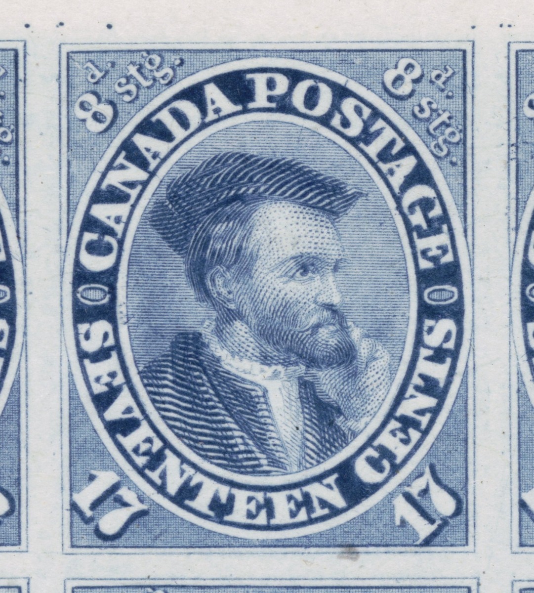 Four guide dots in North margin - 3 near the North West corner and 1 near the North East corner - the 2 dots farthest West are North of the West frame line and the outer dot is very faint; main position dot is oval North West and South East slightly North of centre about 1/2 East or better.
