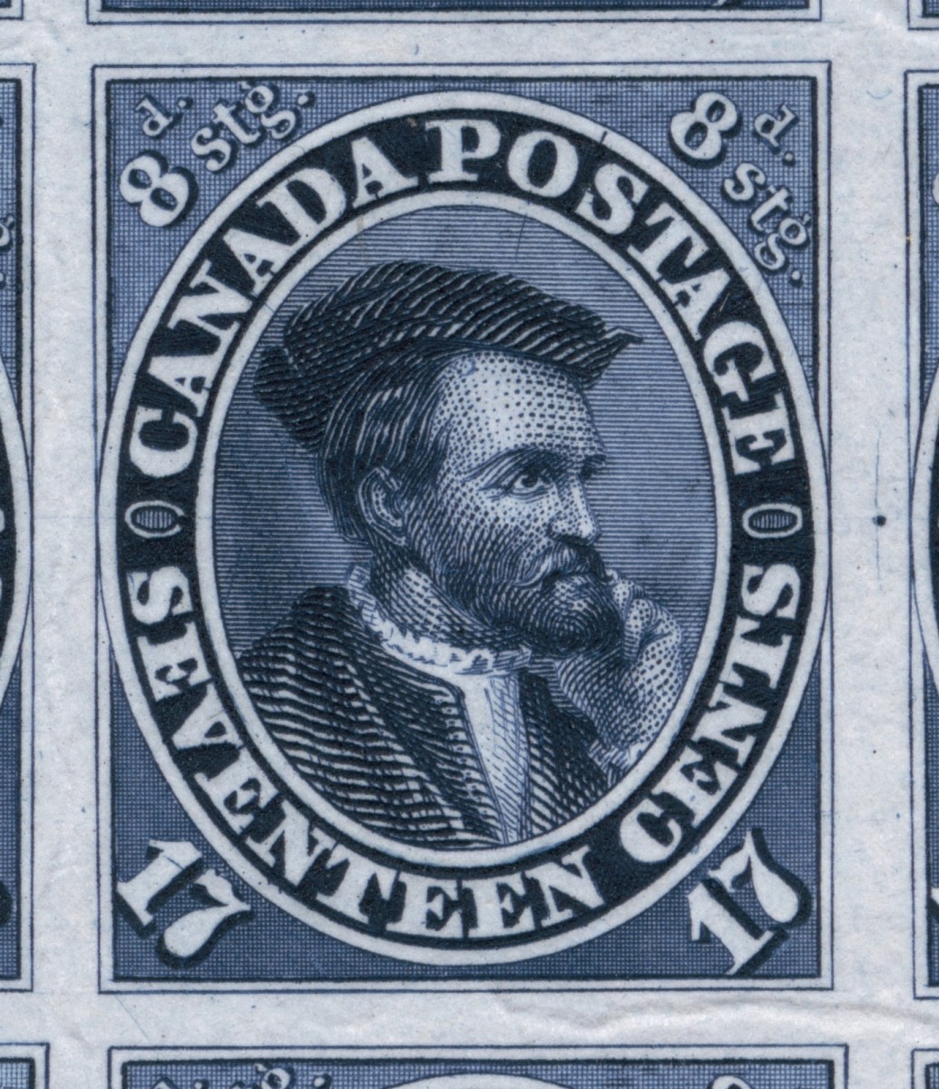 The LH oval frame dot is below but touching the horizontal guide line. There is potentially a long tool line running obliquely from the "P" of "POSTAGE" down through the whole stamp