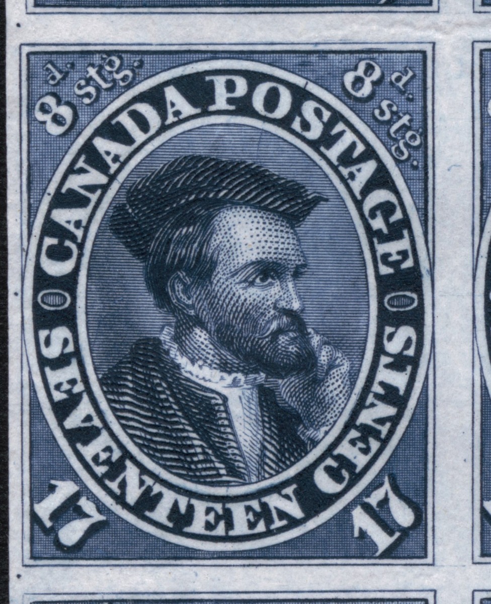 Guide dot at left of frame, small break in frame line lower right, small dot in white oval just above 1st A of Canada.Re-entry on inner frameline at top, above 8, and on outer frameline above S of POSTAGE.