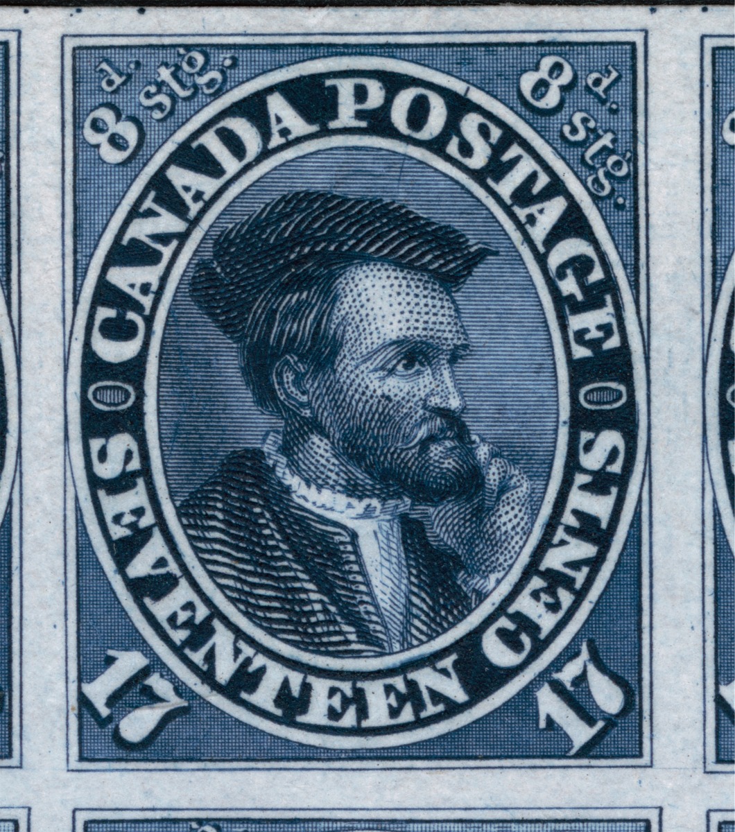 Shows the doubling in bottom letters GE of postage as well as line in oval above AGE. Travelling dot on cheek. Main position dot not visible. This also shows the top guideline and dots in top margin, 3 at left, and 1 at right.