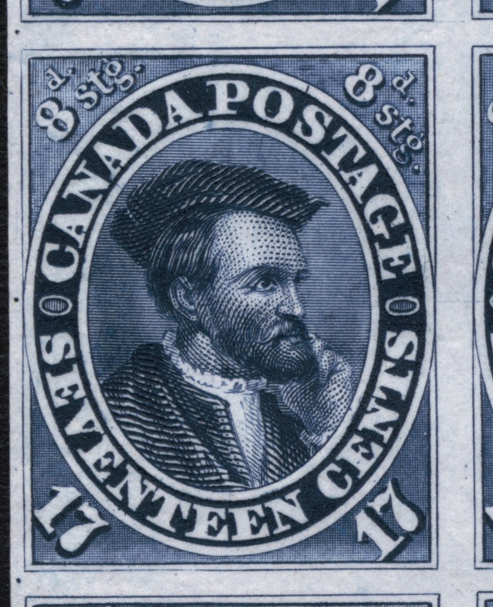 Top, center and bottom large dots west of left frame, typical of 1st column. Large short transfer across stamp bottom, as well as in the upper right corner, aroung 8 d. stg and faint short entryat top right.