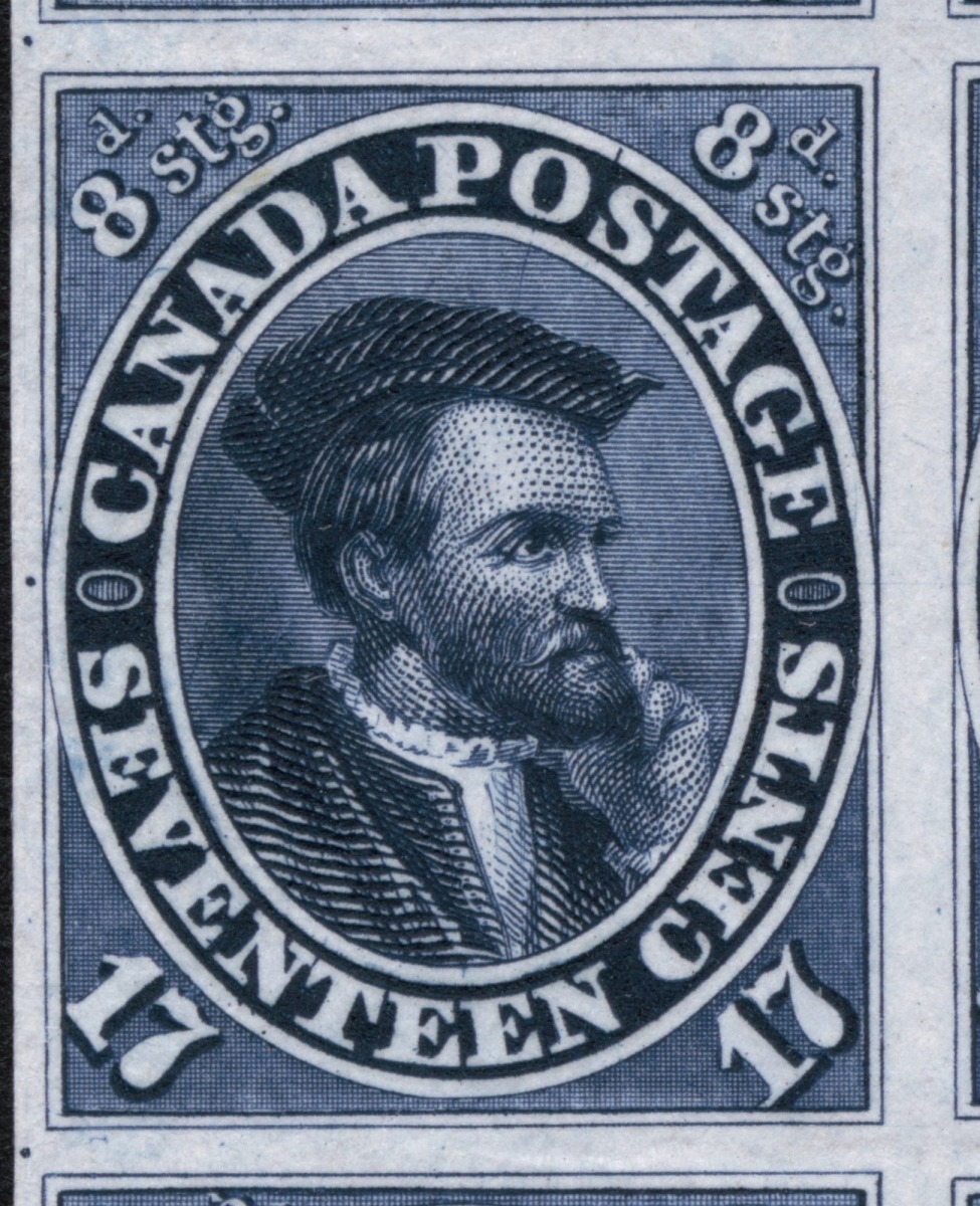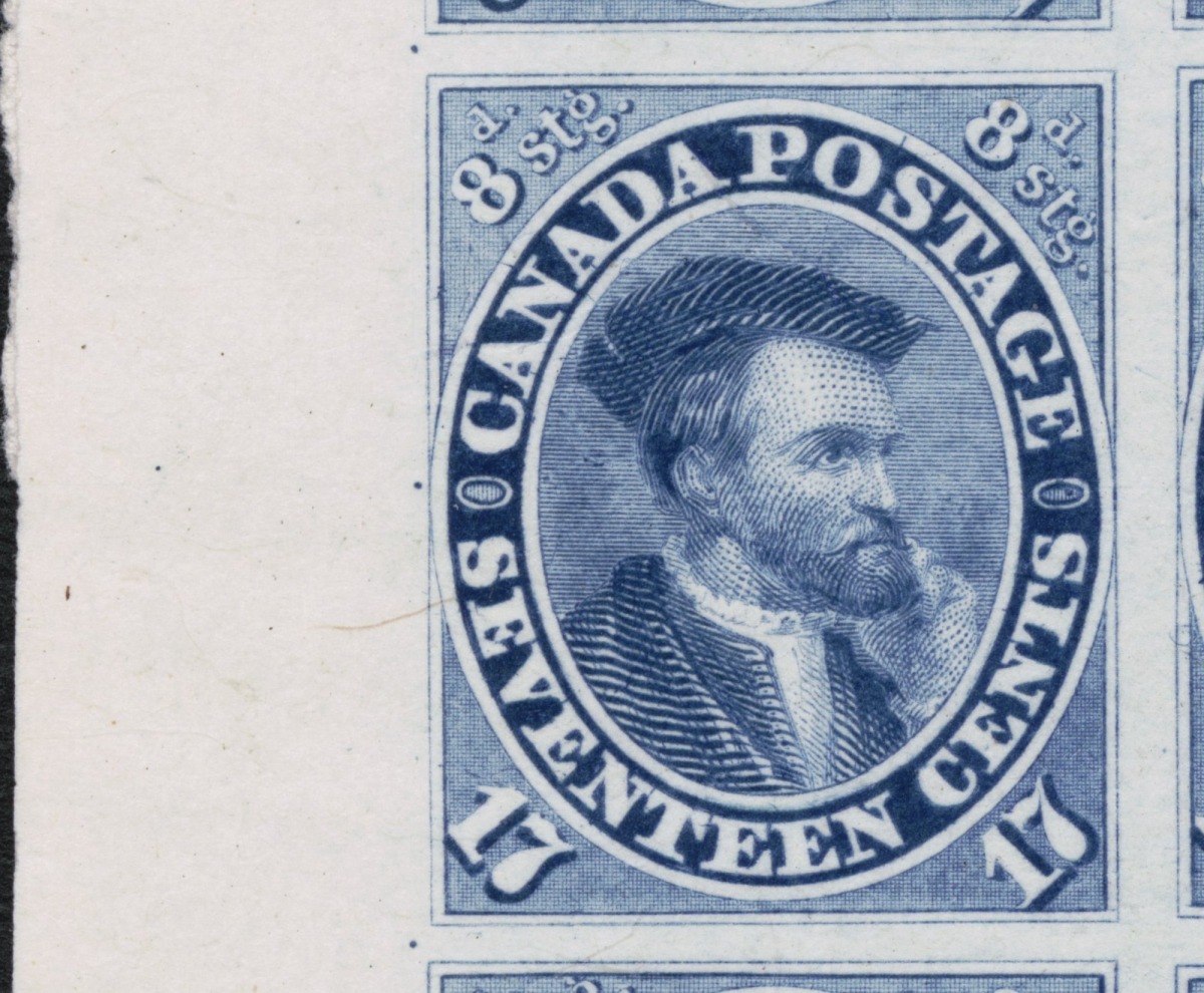 Left oval dot at 3 o'clock, faint vertical transfer at upper right.There is also a small mark in the white part of the large Oval, just below the C of Canada.