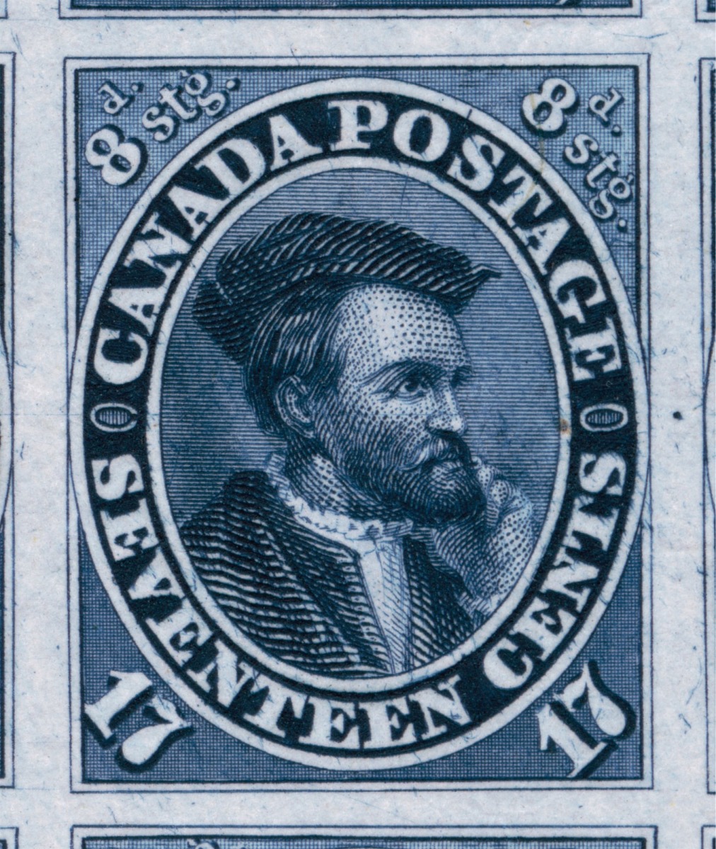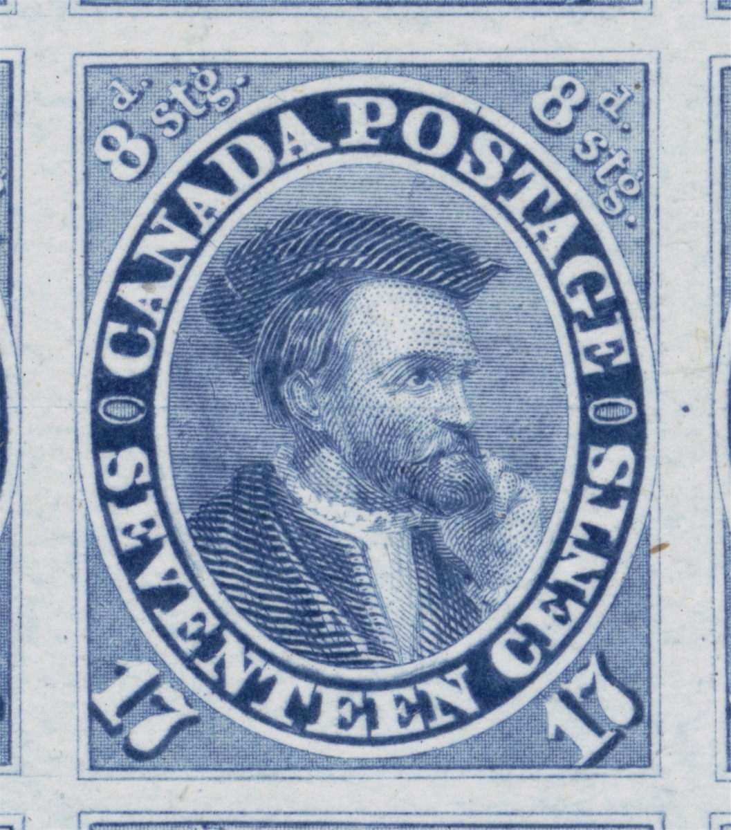 Position dot on left oval at 3 o'clock, and a weak short transfer present on top right upper-right spandrel, east of 8d.Position dot in left oval below Guideline, strong short transfer upper right, large dot in right margin at centre. This stamp has some inking marks right of V of seventeen (not constant).