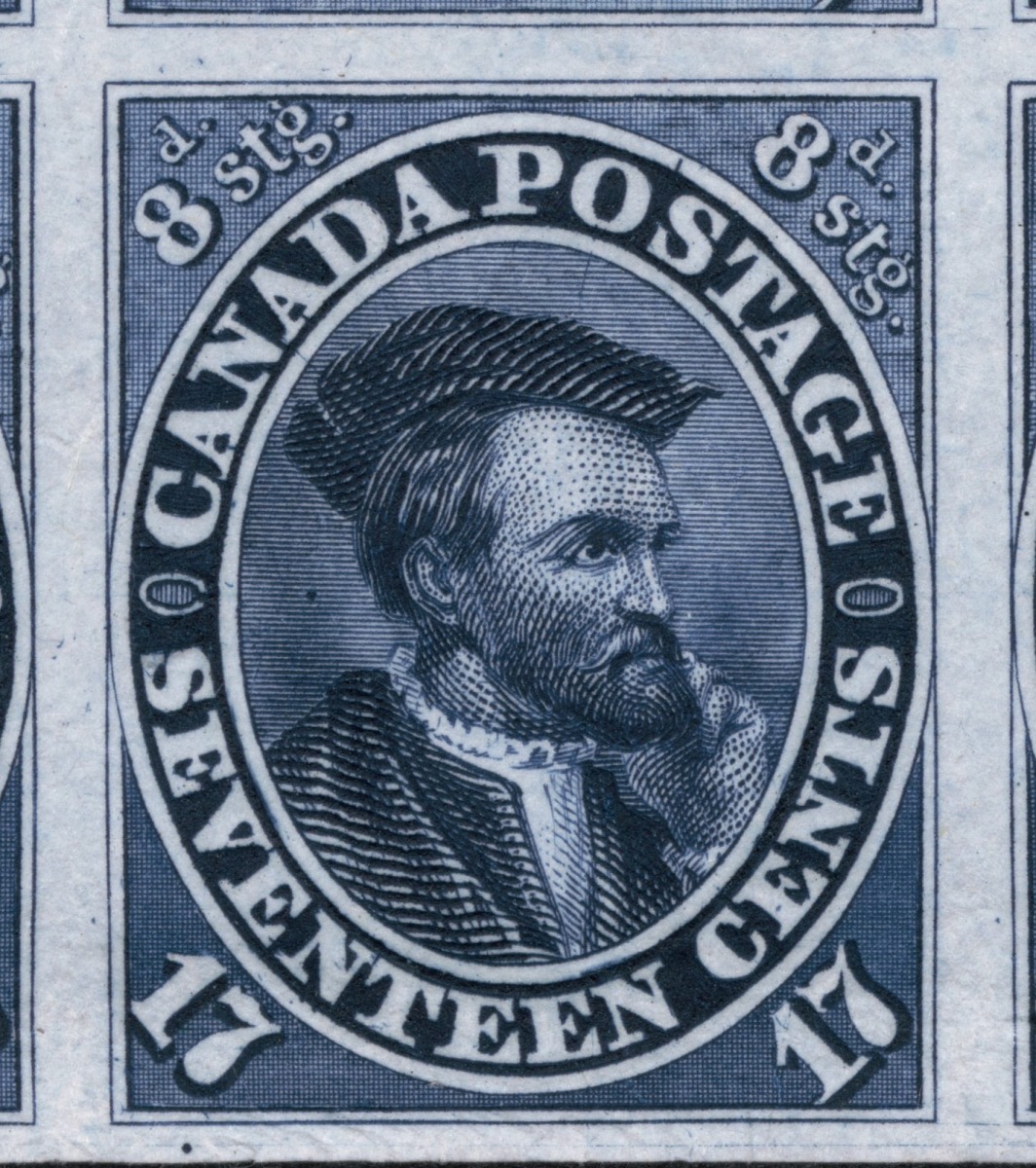 There is a strong guide dot outside the LL corner and a small dot in the LH oval frame adjacent to the "C" of "CANADA''.